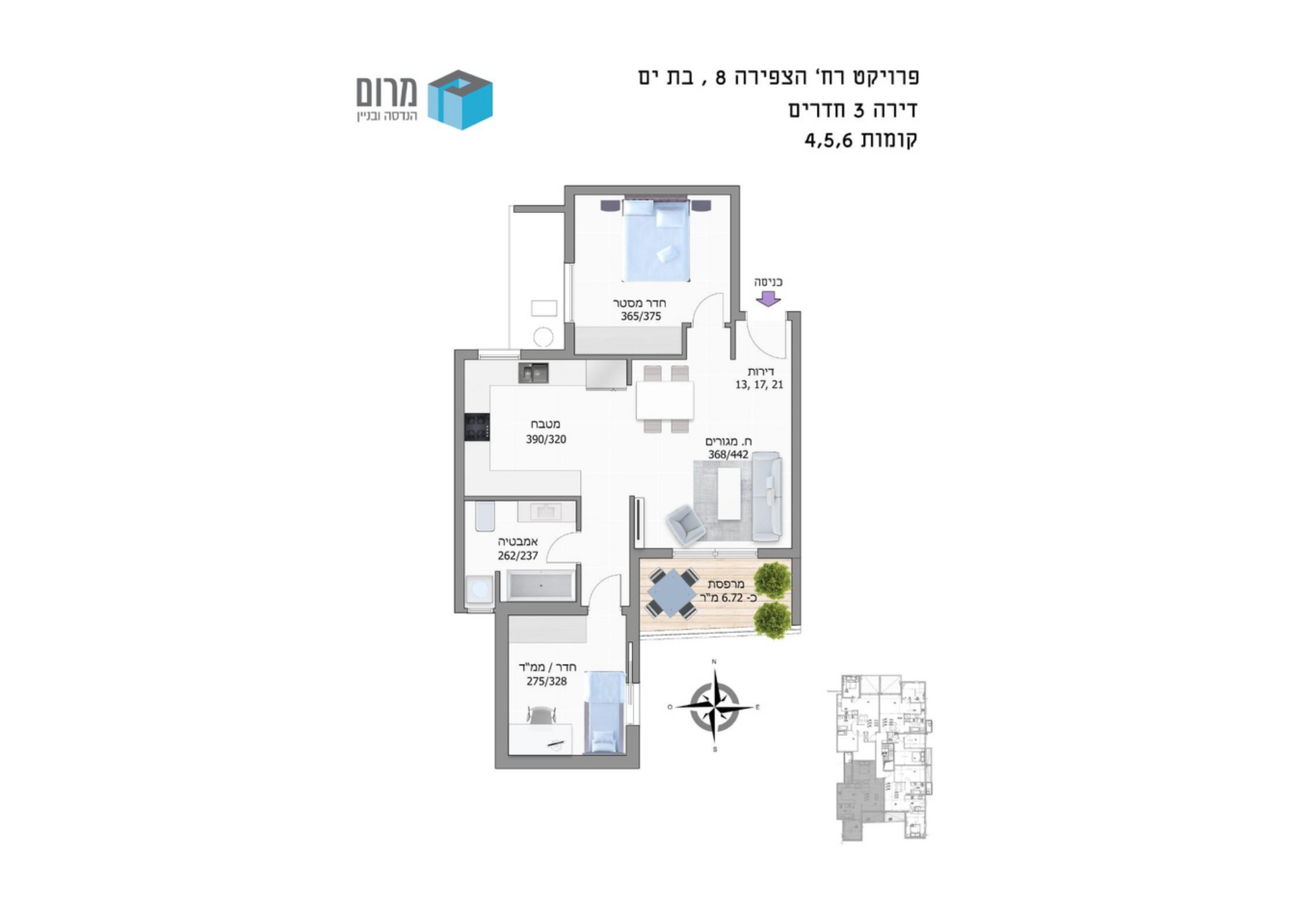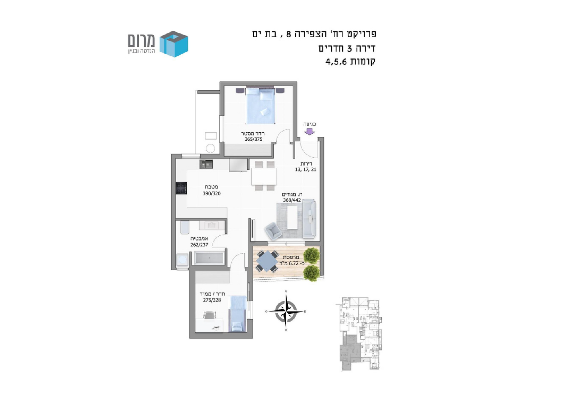 | 3 Pièces | 4 | 72 m² | 7 m² | Sud-Ouest | 2 080 000 ₪ |